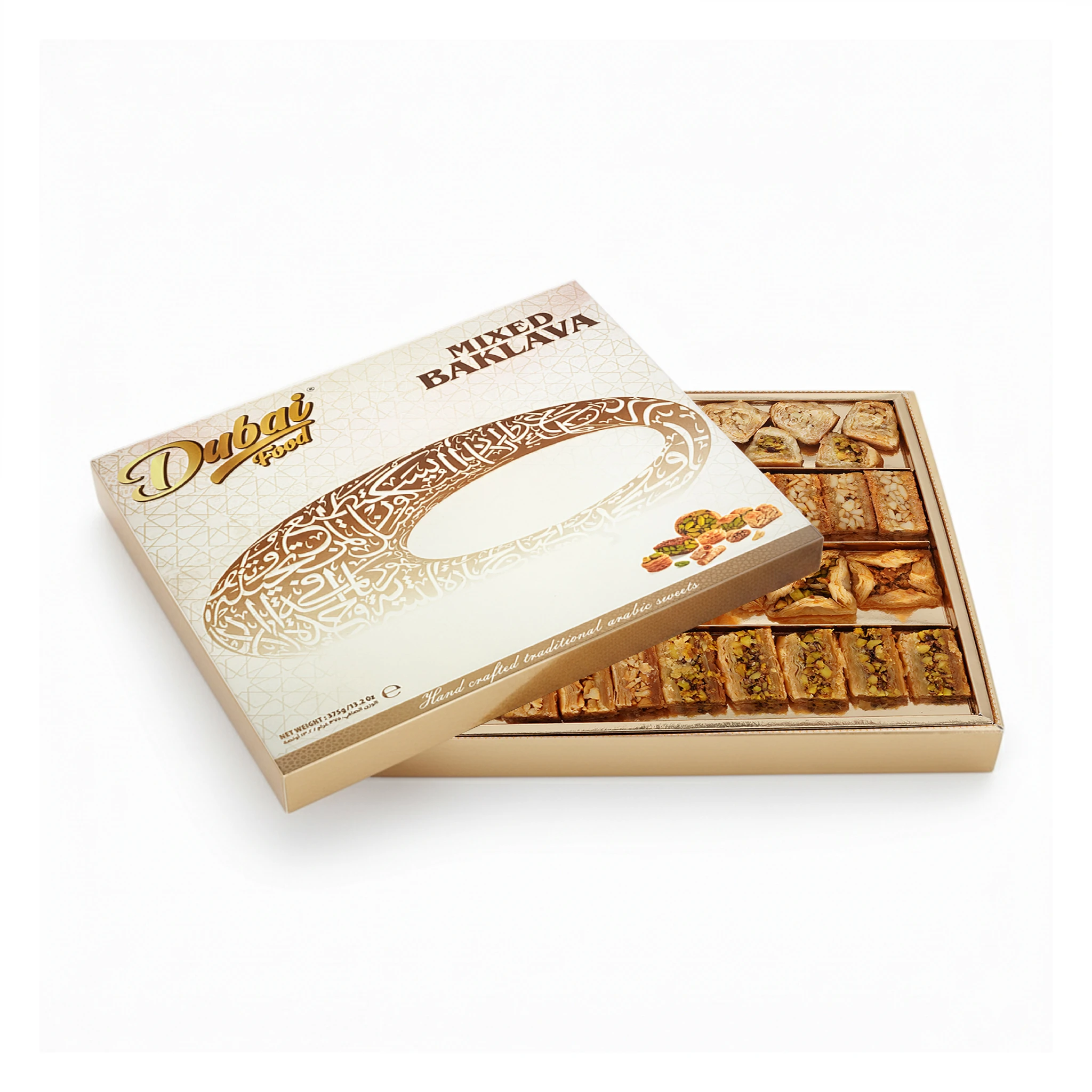 A delicious assortment of premium Arabic sweets, including Bokaj Cashew, Bokaj Pistachio, Kol W Shkor Cashew, Kol W Shkor Pistachio, Baloria Cashew, Baloria Pistachio, Asia Cashew, Asia Pistachio, and Finger Cashew. Each piece is delicately prepared using quality ingredients to deliver an authentic Middle Eastern taste experience.Milk Powder, Water, Butter Ghee (Milk), Wheat Flour, Salt, Sugar Syrup, Corn Flour, Pistachio (30%), Cashew (30%).